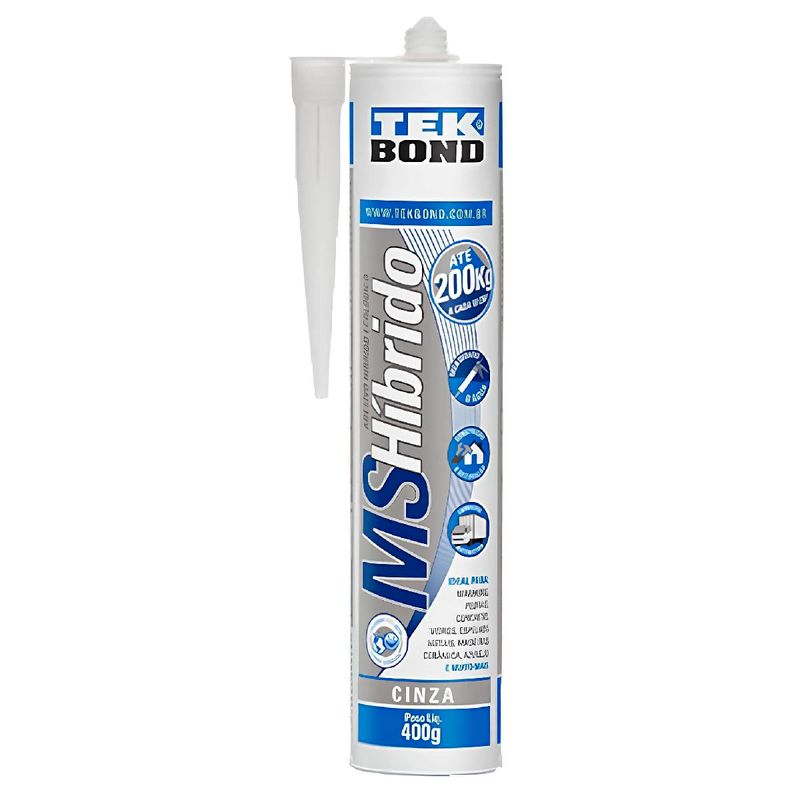 O Adesivo Híbrido Tekbond Cinza é um adesivo flexível, sem cheiro e que possui resistência aos raios UV. Seca mesmo debaixo d’água e pode ser pintado depois de seco. Seu uso é recomendado em materiais variados como pedras, mármore, concreto, vidros, espelhos, madeiras, entre outros.