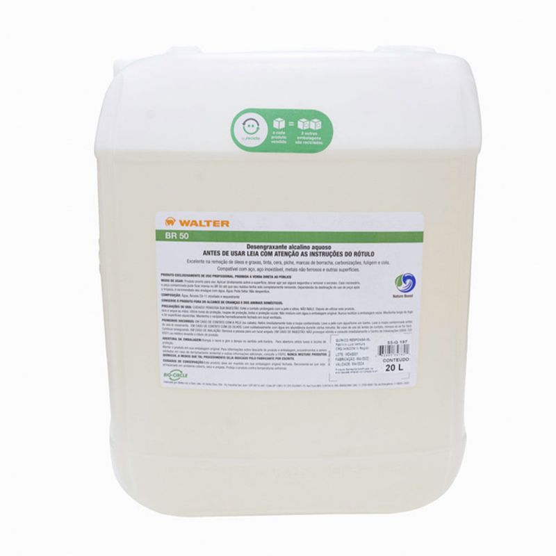 O Agente de Limpeza BR-50 Walter 20 Litros é um poderoso desengraxante industrial, biodegradável, não inflamável, não corrosivo, livre de solventes, fosfato e butil. Ideal e amplamente utilizado na remoção de óleos, graxas e outros contaminantes mais resistentes, é equipado com a tecnologia de microemulsão e apresenta excelente resultado quando utilizado em temperatura ambiente.
