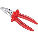 Corpo em aço Gedore-Vanadium e empunhadura em polímero anti-chamas. Acabamento niquelado, cromado e polido. Empunhadura ergomômica, com abas protetoras arredondas para maior conforto e segurança. Produzida por imersão, propiciando isolação até 1000 V, conforme norma EN 60900 / IEC 60900, submetida à ensaios de: impacto, tensão elétrica, aderência, inflamabilidade e pressão/penetração. Utilizar ferramentas isoladas VDE, em tensão máxima de 1000 V em corrente alternada e 1500 V em corrente contínua, conforme norma EN 60900 / IEC 60900. Possui dupla camada de isolação Check-Tool, no exterior é na cor vermelha, padrão Gedore. Atende com segurança a norma regulamentadora NR 10 - Segurança em Instalações e Serviços em Eletricidade, possui certificado de isolação. Tratamento térmico total e corte temperado por indução com dureza 62 - 64 HRC, permitindo uso contínuo, mesmo em condições extremas. Permite cortar, puxar, segurar e dobrar fios. O sistema Kraft “Power Pliers”, permite capacidades mais elevadas de corte, com 35% menos de força do usuário, devido à combinação ótima da geometria de corte, alojamento excêntrico, grande efeito alavanca e design ergonômico da empunhadura. Propicia máximo rendimento e corte com mais facilidade. As mandíbulas planas e ovaladas permitem segurar com firmeza superfícies com forma chata, cilíndrica, oval, quadrada, sextavada, oitavada ou poligonal. Propicia máximo rendimento com corte mais facilitado. Indicado para cortar todos os tipos de arame, inclusive corda de piano com diâmetro máximo de Ø 1,6 mm e com resistência à tração 2300 N/mm² CódigoReferênciaL3 mmW3 mmW4 mmT1 mm