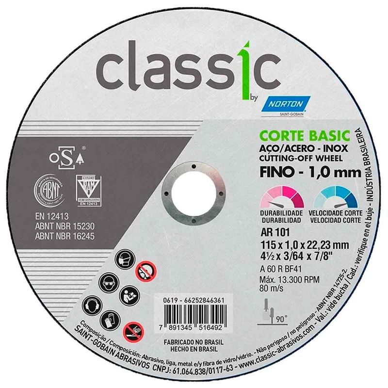 O Disco Corte 4.1/2 x 1,0 x 7/8 Classic Basic Norton proporciona excelente desempenho em cortes finos com menor esforço do operador. Projetado para trabalhos em aço, tubos e chapas metálicas, combina durabilidade e agilidade. Sua espessura reduzida melhora a precisão e evita aquecimento excessivo. Indicado para manutenção, construção civil e serralherias, é sinônimo de praticidade e eficiência no dia a dia.
