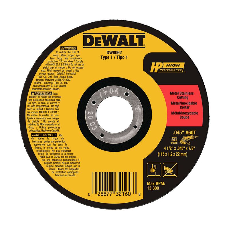 O Disco de Corte 4.1/2" Dewalt DW8062 é um Disco de corte fino Dewalt para Metal e Inox. Ideal para trabalhos de Serralheria, Funilarias, Metalúrgicas, Departamento de manutenção e Construção civil.