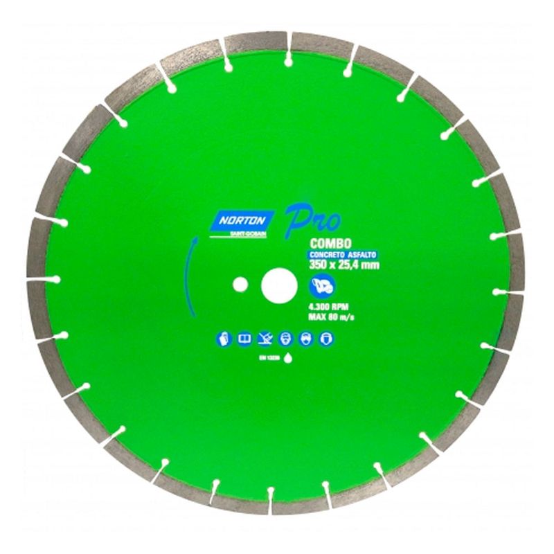 O Disco Diamantado 350 X 25,4mm Norton PRO Combo é indicado para operações que necessitam maior rendimento, sendo ideal para corte de concreto, asfalto, asfalto sobre concreto, concreto verde, concreto curado, concreto reforçado, refratários duros e abrasivos. Sua versatilidade economiza tempo para o operador, que não precisa trocar de disco para o corte de dois materiais.