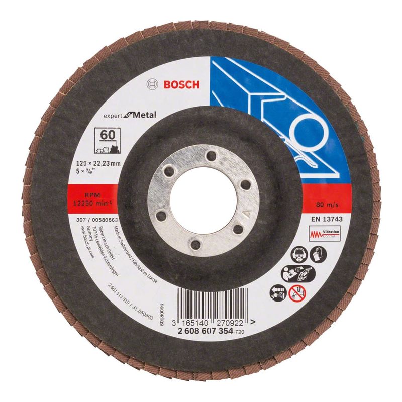 o Disco Lixa Flap-Disc 4.1/2" Bosch X551 EXPERT FOR METAL é composto por um tecido robusto de apoio estável, o que garante a durabilidade e a estabilidade durante aquelas operações mais difíceis, além da colagem de resina sintética que fornece resistência nas operações de desbaste.