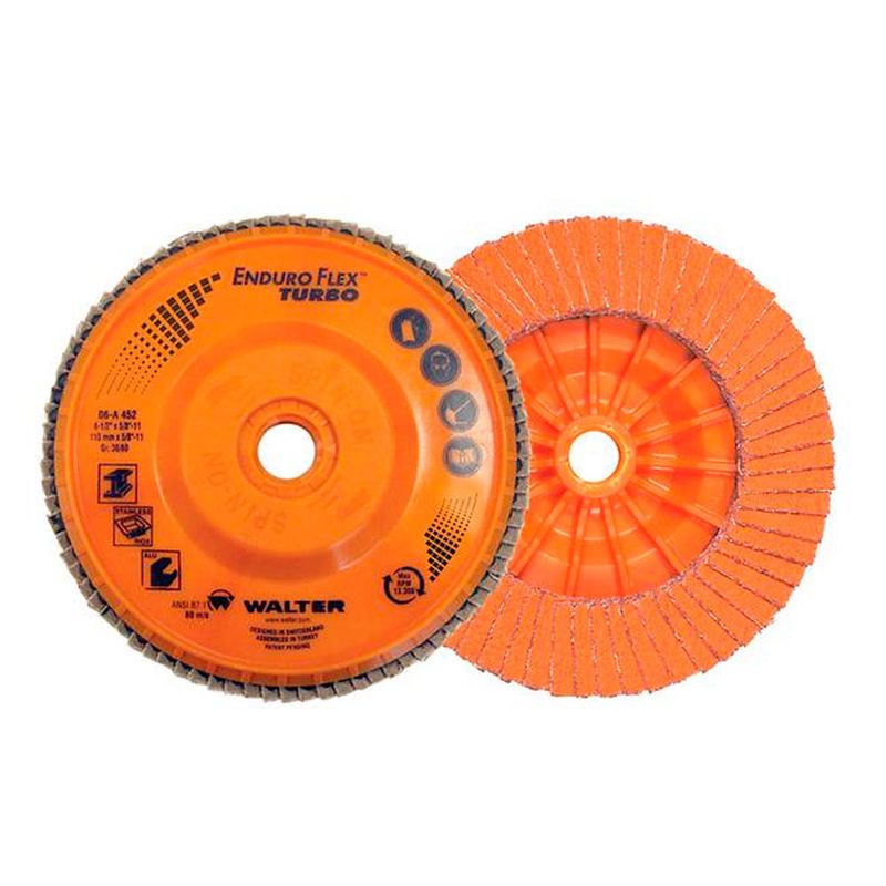 O Disco Lixa Flap-Disc 4.1/2" Walter Enduro-Flex Turbo 06A422 é equipado com a tecnologia de refrigeração Turbofan, que é capaz de manter o produto refrigerado, reduzindo assim os danos na superfície durante a operação, o que também aumenta a sua vida útil.
