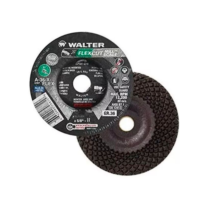 O Disco Lixa Walter 4.1/2" Flexcut Mill Scale 15-L 943 é ideal para realizar a remoção de carepas (fina camada de óxido de ferro que cobre a superfície de placas laminadas de aço, chapas ou perfis) sem vitrificar ou empastar o disco, fornecendo uma superfície limpa e uniforme ao final do procedimento.