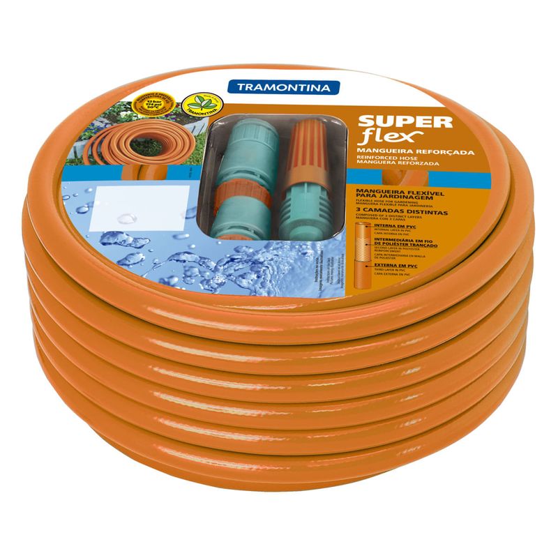 A Mangueira de Jardim Super Flex 1/2" Tramontina com Engate acompanha engates rápidos e esguicho, levando conforto e bem-estar na manutenção de jardins e hortas. Produzida em PVC, material que garante flexibilidade e resistência, é prática e fácil de usar e graças ao seu tamanho, consegue chegar em pontos difíceis do seu jardim.