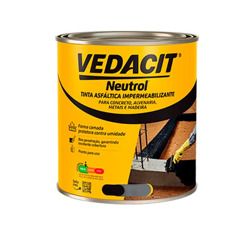 A Manta Líquida Vedapren Base Asfáltica Vedacit Preto é uma manta líquida à base de asfalto e secagem de 6 horas entre demãos. É aplicada a frio, pronta para uso e moldada no local. É indicada para lajes transitáveis, áreas cobertas molhadas e molháveis desde que sejam posteriormente revestidas com cerâmica ou proteção mecânica (contrapiso). Cobre a estrutura com uma proteção impermeável, apresenta ótimas características de elasticidade e tem uma boa durabilidade.
