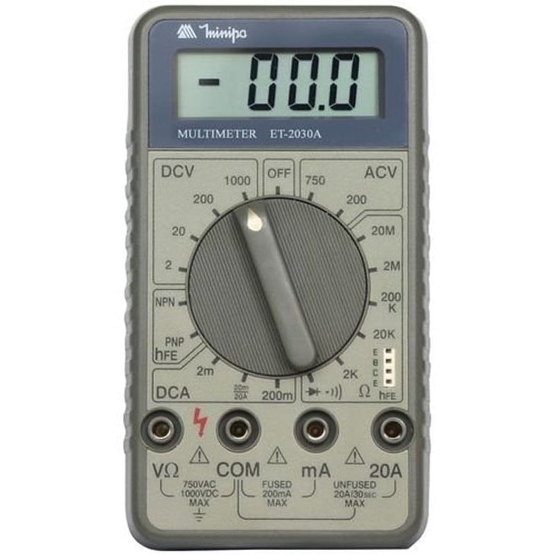 Instrumento digital portátil, de acordo com a categoria II de segurança; Display LCD de 3 1/2 dígitos, que realiza medidas de tensão DC e AC, corrente DC até 20A, resistência e testes de diodo, transistor hFE e continuidade.
