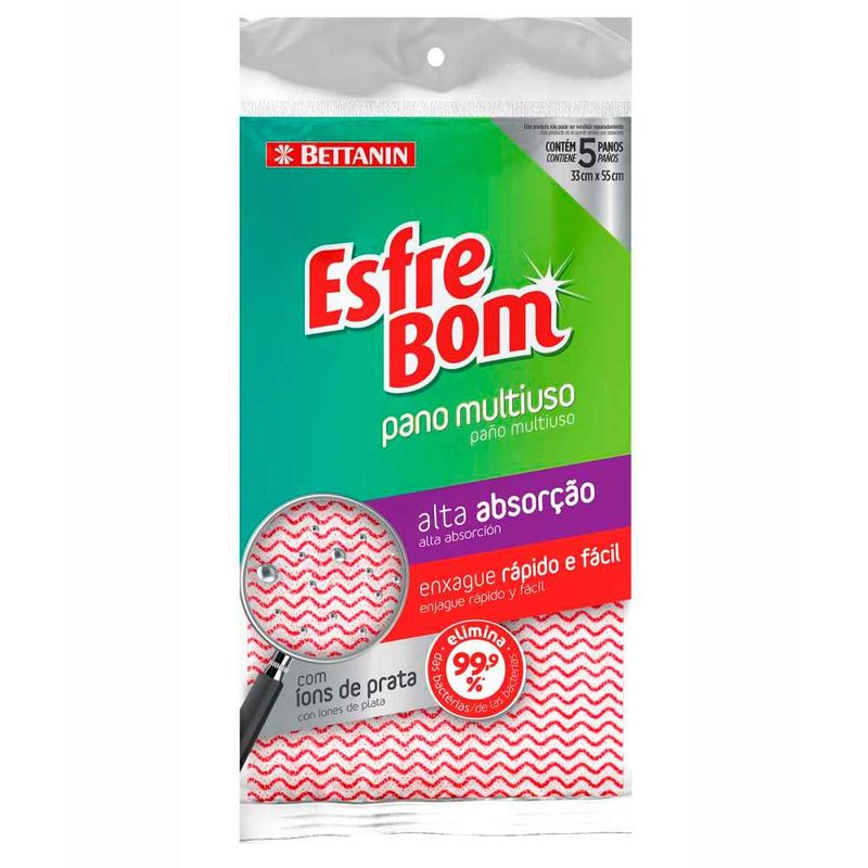 O Pano Multiuso Esfrebom com 5 Un Vermelho pode ser usado em cada cantinho da casa! É um produto desenvolvido com tecnologia de proteção antibacteriana, que elimina a proliferação de bactérias e mau cheiro. Possui alta absorção, é de enxágue rápido e fácil e indicado para a limpeza de fogão, móveis e pias.