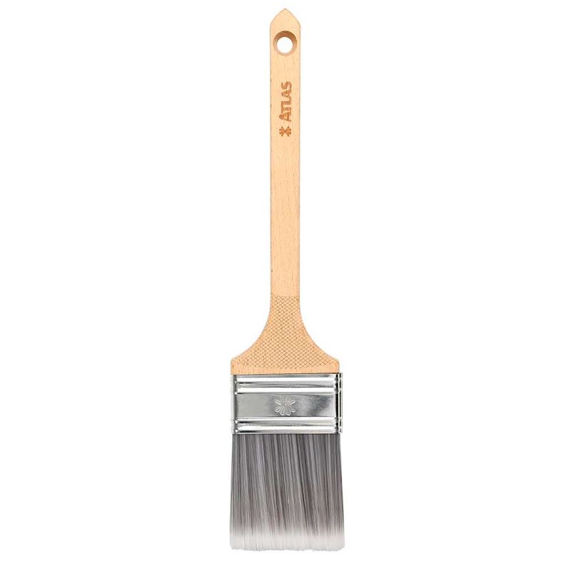 O Pincel Especial Reto Longo 2" 1/2 Atlas Imperial Plumatek com cabo de madeira e cerdas monofilamentares designado para detalhes e acabamento preciso em paredes e janelas, compatível com diversos tipos de tinta.