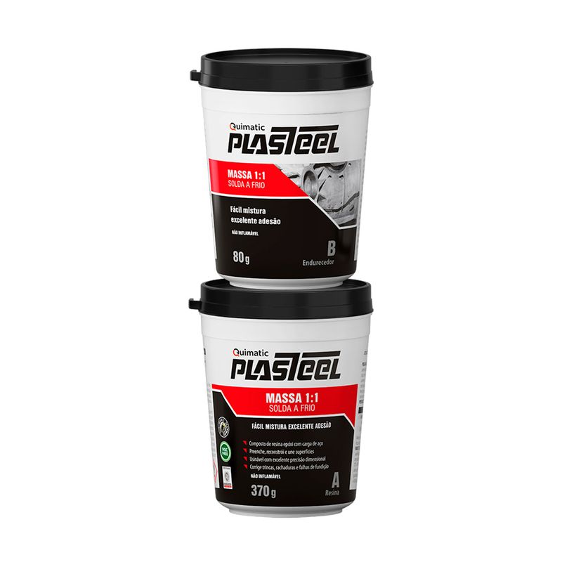 A Plasteel Massa 1:1 Solda a Frio PM1 Quimatic Tapmatic 450 g é um composto de resina epóxi reforçado com carga de aço. Para reparo de vazamentos, peças com trincas, rachaduras, falhas de fundição, desgastes superficiais e erros de usinagem. Oferece excelente adesão sobre a superfície, inclusive em superfícies que por acaso ficou resíduos de óleo ou umidade. Sua proporção de mistura 1:1 facilita o preparo do produto e seu tempo de cura é maior, oferecendo mais tempo para aplicação, principalmente em grandes reparos. Fornecido em kit com total de 450 g, 3,600 kg e 14,8 kg.
