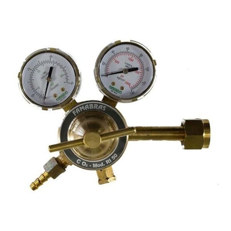 Regulador de simples estágio para gás CO2, com 1 manômetro de leitura da pressão de entrada e 1 manômetro de leitura da pressão ou vazão de saída;