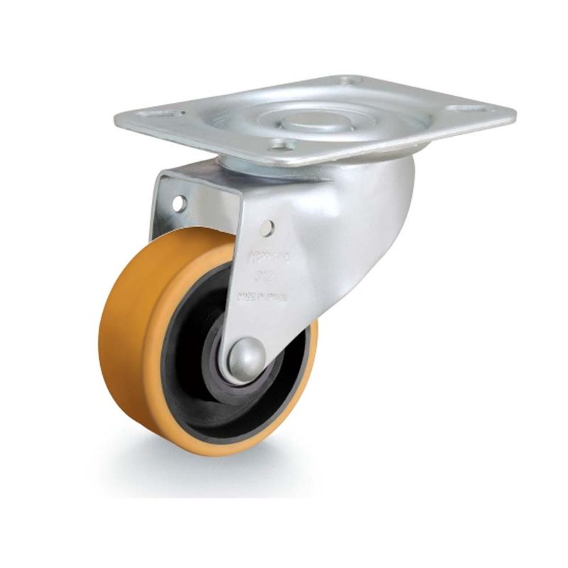 Roda de poliuretano moldado com núcleo em ferro fundido e mancal com rolamento esférico. Usado