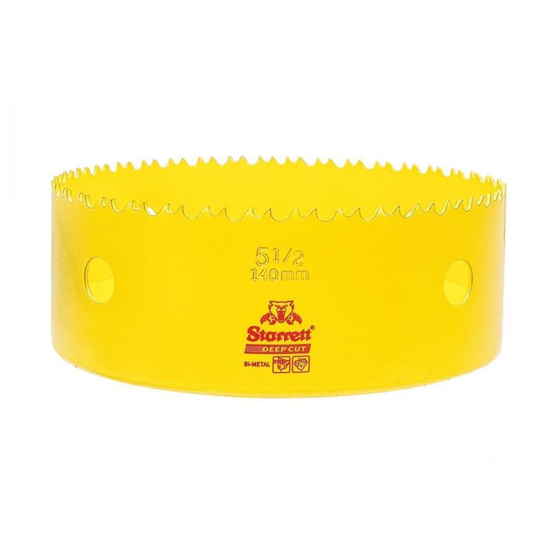 Serra Copo 140mm 5.1/2" Starrett Deep Cut (DCH0512-G) combina o tipo de dente testado e comprovado da Serra Dual Pitch com um novo material do dente, com maior resistência ao calor e ao desgaste, possuindo uma maior vida útil. Apresenta uma profundidade da serra de 51mm (2”), e é ideal para cortar metais materiais sólidos ou tubos com espessura de parede superior a 3mm. Proporciona cortes com penetração agressiva e folga na abertura da trava.