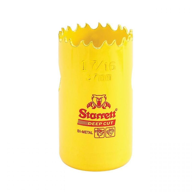 Serra Copo 37mm 1.7/16" Starrett Deep Cut (DCH0176-G) combina o tipo de dente testado e comprovado da Serra Dual Pitch com um novo material do dente, com maior resistência ao calor e ao desgaste, possuindo uma maior vida útil. Apresenta uma profundidade da serra de 51mm (2”), e é ideal para cortar metais materiais sólidos ou tubos com espessura de parede superior a 3mm. Proporciona cortes com penetração agressiva e folga na abertura da trava.