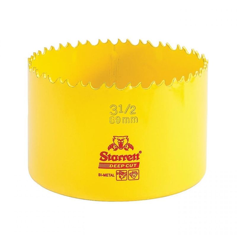 Serra Copo 89mm 3.1/2" Starrett Deep Cut (DCH0312-G) combina o tipo de dente testado e comprovado da Serra Dual Pitch com um novo material do dente, com maior resistência ao calor e ao desgaste, possuindo uma maior vida útil. Apresenta uma profundidade da serra de 51mm (2”), e é ideal para cortar metais materiais sólidos ou tubos com espessura de parede superior a 3mm. Proporciona cortes com penetração agressiva e folga na abertura da trava.
