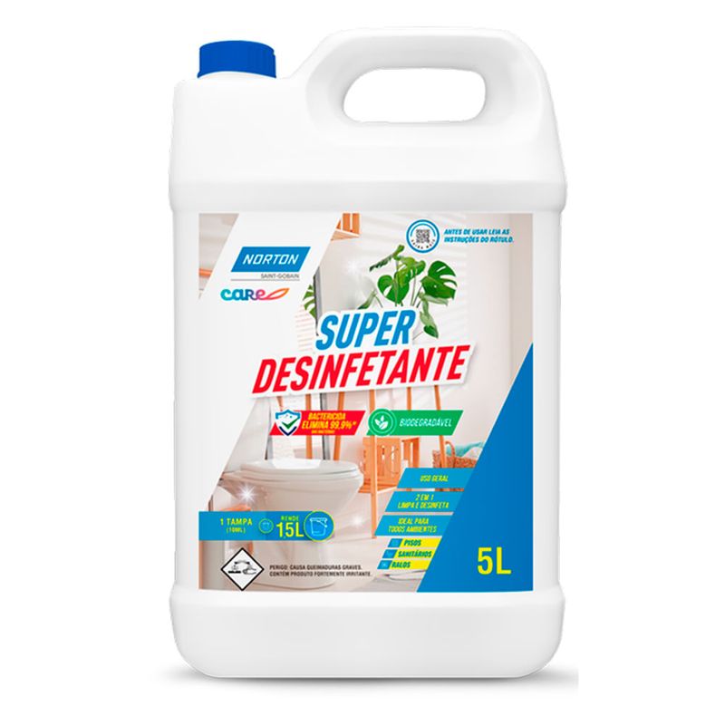 O Super Desinfetante Norton Care 5L é indicado para desinfetar e limpar superfícies de forma segura e eficiente, atuando na eliminação de vírus e bactérias.
